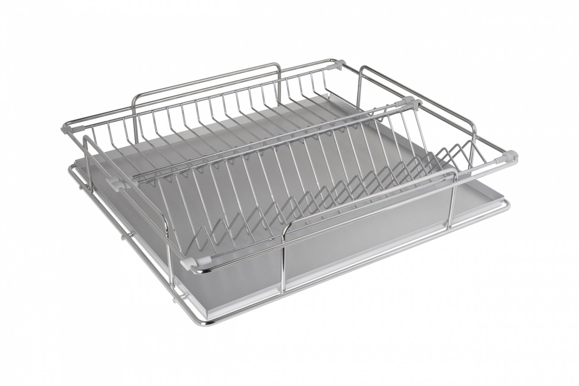 Scolapiatti per cassetto e per colonna in filo acciaio inossidabile AISI 304, ad estrazione totale ammortizzata, con finitura cromo completo di raccogligocce in alluminio
